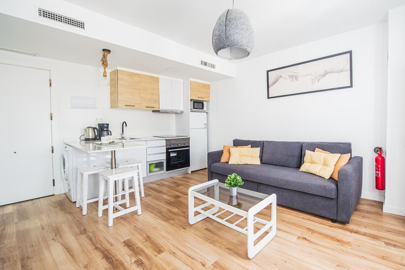 One-Bedroom Apartment. This air-conditioned apartment comes with 1 living room, 1 separate bedroom and 1 bathroom with a shower. Meals can be prepared in the well-fitted kitchen, which features a stovetop, a refrigerator, kitchenware and an oven. The apartment features a flat-screen TV, a washing machine, soundproof walls, a tea and coffee maker as well as city views. The unit has 2 beds.